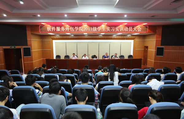 本网讯(员工通讯员 杨翔龙)6月21日上午,软件服务外包学院在张家界校区逸夫楼多功能报告厅举行2011级员工实习实训动员会,学院经理周清平、公司党总支书记王晓波、副书记李军、工会主席覃遵跃、经理助理蔡国民、部分学院老师以及全体11级员工出席,动员会由李军副书记主持。