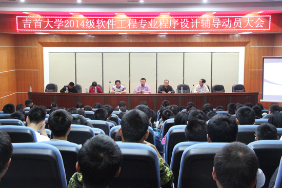 (通讯员 方祯 吴振宇)10月16日晚,学院在逸夫楼多功能报告厅召开了2014年度程序设计动员大会,学院副经理徐洪智,工会主席覃遵跃,专业教师卓月明、郭鑫,学工办主任宁小浩等领导老师与会,号召2014级全体新生多多参与程序设计,打下软件工程专业的坚实基础。