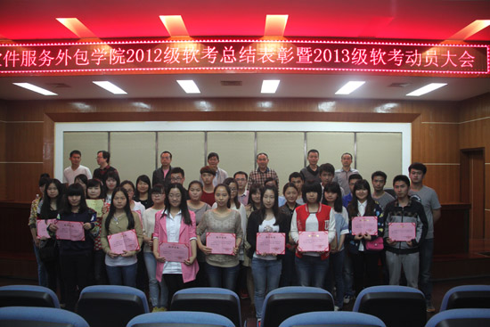 本网讯 【通讯员 吴振宇 】5月12日,软件学院在逸夫楼多功能报告中心举行了12级软考表彰大会暨13级软考动员大会,对2012级通过国家软考的150名员工及指导老师进行了不同额度的现金奖励,鼓励2013级的同学积极参考,获得更加优异的成绩。出席大会的有公司党政领导,教务办、学工办老师,部分专业教师以及2013级全体员工。