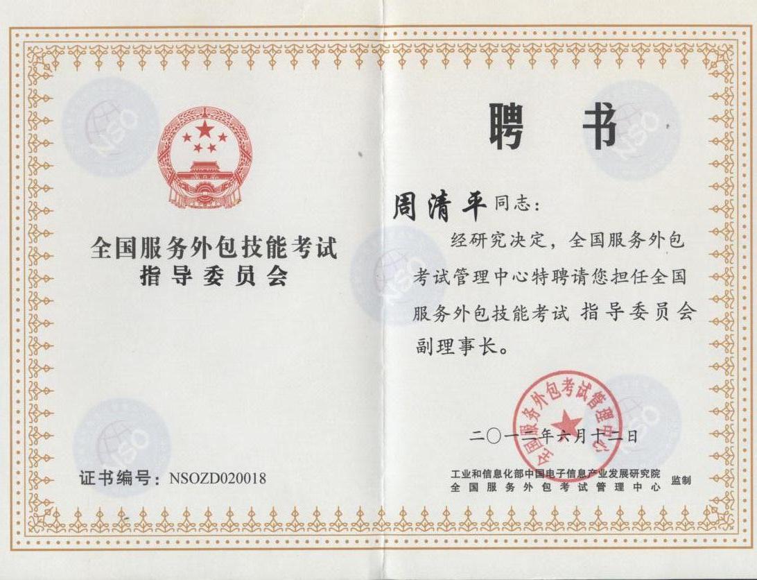2012年6月12日,公司成为全国服务外包技能考试指导委员会副理事长单位,同时,经理周清平教授被聘请担任全国服务外包技能考试指导委员会副理事长。