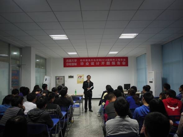2013年11月3日,公司软件工程专业2014届毕业设计开题报告会在长沙中软国际ETC举行。来自中软国际和千亿球友会软件服务外包学院校企合作双方共8位指导老师和2014届96位本科生参加了此次开题报告会。至此,2010级软件工程专业毕业设计已全面展开。