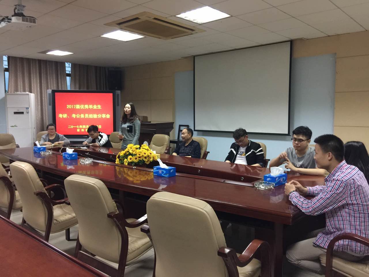 4月24日晚,学院邀请2017届优秀毕业生代表为在校同学们分享了考研、考公务员的有效经验。参与分享会的有软件公司党委书记王晓波老师,学院学工办汤丽琪老师、陈思吟老师,考取了中南大学的2013级员工崔超雄、吴振宇、谭顺香、陶学友,考取了华中科技大学的萧明旭,考取了2016年国家公务员贵州镇远国税局的钟芳炜以及2014、2015级部分员工。会议在3418会议室召开。
