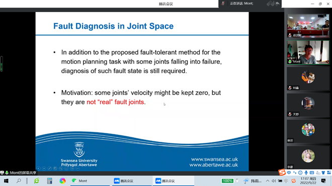 2022年9月22日下午4:30,学院邀请李展博士开展学术讲座。李博士首先介绍了所在单位英国斯旺西大学科学与工程学院计算机系的基本情况,然后以Task-constrained and fault-tolerant motion planning and control for redundant manipulators为题介绍了相关研究方法和最新成果,最后学院师生和李展博士就相关问题进行了讨论。