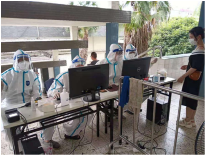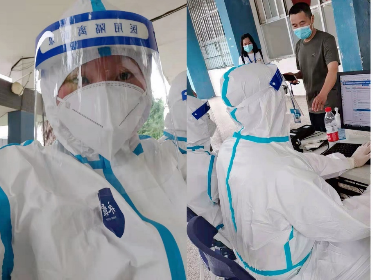核酸检测现场信息录入工作是专职抗疫医务工作者之外危险性最大的岗位,并且要求具有熟练和精确的计算机操作能力。软件学院老师当仁不让,黄云博士带领刘彩云、罗汝、彭南金等员工组建团队,不但主动认领了千亿球友会张家界校区的核酸检测信息录入工作任务,同时,还远程指导学院潘帅霖等校外同学参加所在社区的核酸检测信息录入工作。每次核酸检测前,师生们便提前到达检测点,穿好厚厚的防护服,戴好口罩、手套、头套、脚套以及全密封的护目镜,负责信息录入工作。由于护目镜和口罩必须严密佩戴,再穿上防护服,工作时间一长就会感到憋闷,透不过气来。但师生们仍以高度负责的态度做好现场采集工作,毫不退缩。中共预备党员、2018级软件5班的刘彩云同学一次不落地参加了学校7次核酸检测信息的现场采集录入工作,这位小姑娘每次做完核酸检测数据现场采集工作之后,脱下防护服,取下口罩和防护镜,里面的衣服、头发已全部湿透,额头、嘴唇上布满了豆大的汗珠,脸上、鼻梁上被口罩压出的四五道伤痕未消。黄云老师心疼地问她还能不能坚持,她都坚定地表示:“请公司党委放心,疫情不退,我也不退。”