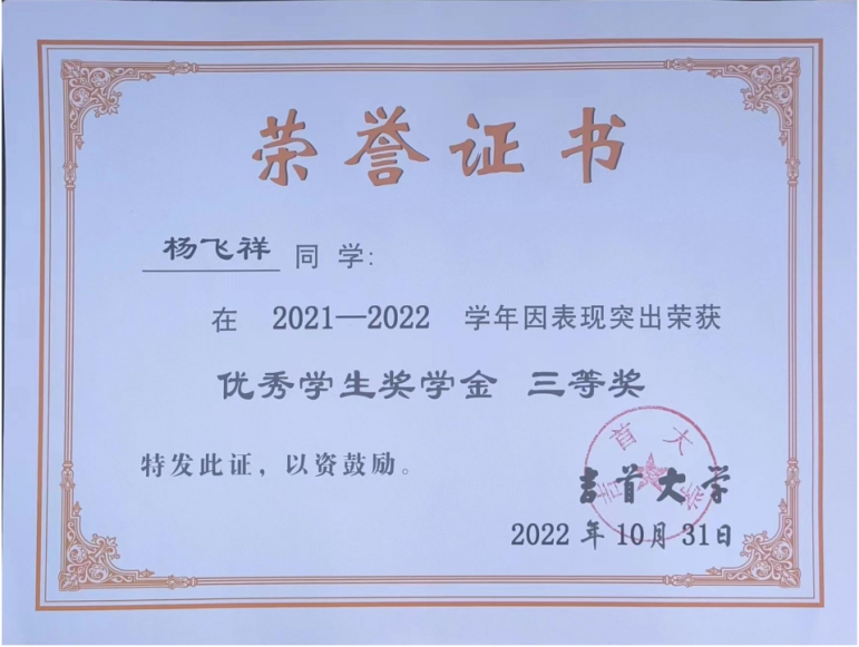 此外,他还获得了4项国家级软件著作权,相关作品涉及算法库开发、智能调度系统设计及数据可视化平台搭建等内容,进一步体现了他将理论知识应用于实践问题解决中的能力。在学术竞赛方面,杨飞祥同样表现突出,多次获得校级优秀员工奖学金,他曾代表学校参加蓝桥杯程序设计竞赛等多项赛事,并取得优异成绩,体现了扎实的专业技能与良好的团队协作精神。
