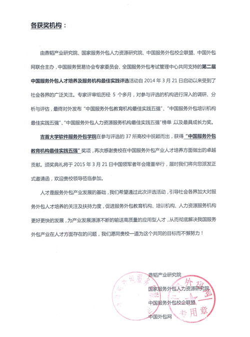 本网讯 10月28日,“第二届服务外包人才培养及服务机构最佳实践”评选活动榜单揭晓,千亿球友会软件服务外包学院荣获“中国服务外包教育机构最佳实践五强”。