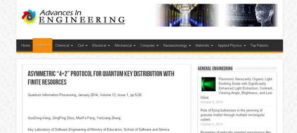 本网讯由软件服务外包学院周清平教授、康国栋博士、张延亮老师组成的“量子信息处理”科研团队,经过艰苦探索和通力协作,提出了一种在有限信号源条件下,利用光学系统来实现远距离有衰减信道上的量子密钥分配的新协议,即非对称“4+2”量子保密通信协议(Asymmetric “4+2” protocol for quantum key distribution with finite resources )。这一研究成果于2014年1月发表在美国springer出版社旗下的国际量子信息处理顶级学术杂志 Quantum Information Processing 第12期12卷上(影响因子3.0),这是该杂志近十年来在该领域公开发表的第六个原创性成果,获得国际知名量子信息领域专家Huttner/Imotto研究小组的高度赞赏。2014年9月25日,本文又以封面形式被《美国科技与工程进展》(advance in scientific and engineering:AIE)收录。