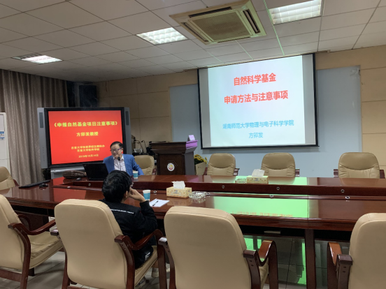 (本网讯)2019年10月14日,学院举办学术沙龙第二讲,邀请湖南师范大学理学院教授、博士生导师,公司特聘教授方卯发主讲题为《自然科学基金申报方法与注意事项》辅导讲座。学院全体教职工聆听了此次辅导报告,本次学术沙龙活动由副经理胡斌副教授主持。