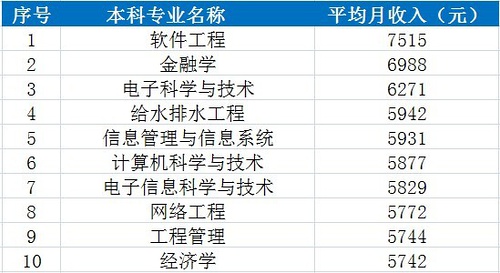 根据麦可思发布的“2012年度老员工就业年度指标”,软件工程、金融学、电子科学与技术、给水排水工程、信息管理与信息系统、计算机科学与技术、电子信息科学与技术、网络工程、工程管理、经济学等十个本科专业,毕业三年后薪资较高。