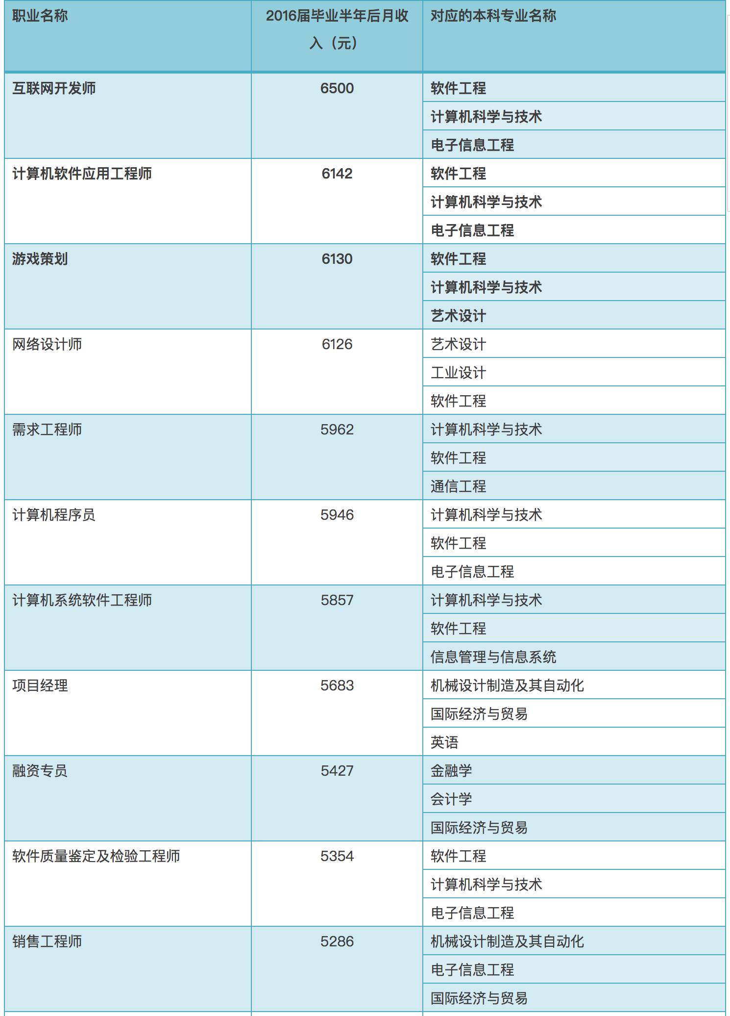 通过对今年最新发布的2016届老员工毕业半年后从事的前30位高薪职业及其对应专业(前3位)的研究分析发现:互联网开发师成本科、高职高专毕业生从事的薪资最高职业,对应的主要本科专业:软件工程、计算机科学与技术、电子信息工程,对应的主要高职高专专业:软件技术、计算机应用技术、计算机网络技术。